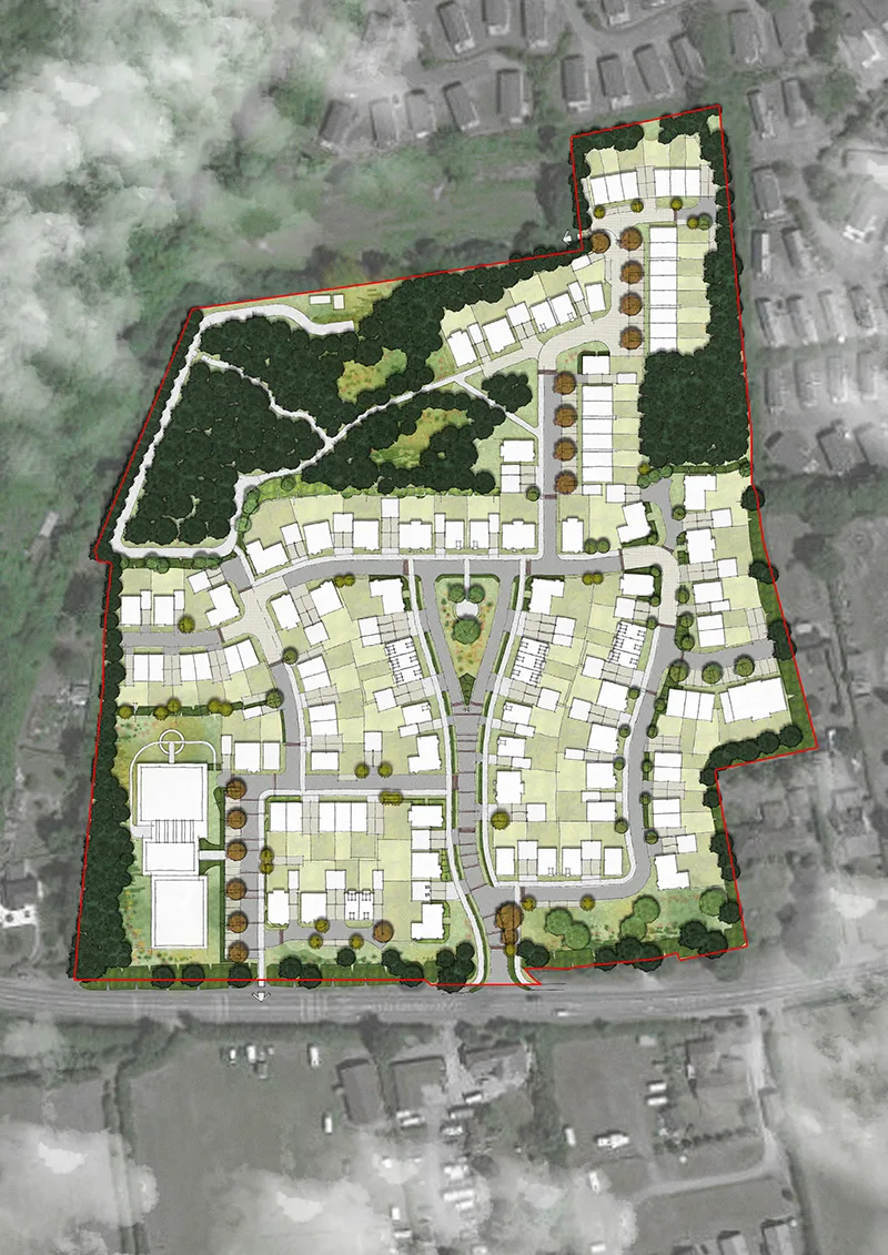 A mixed use development comprising 111 new homes, 40% of which are affordable along with a new care home and associated landscape works.