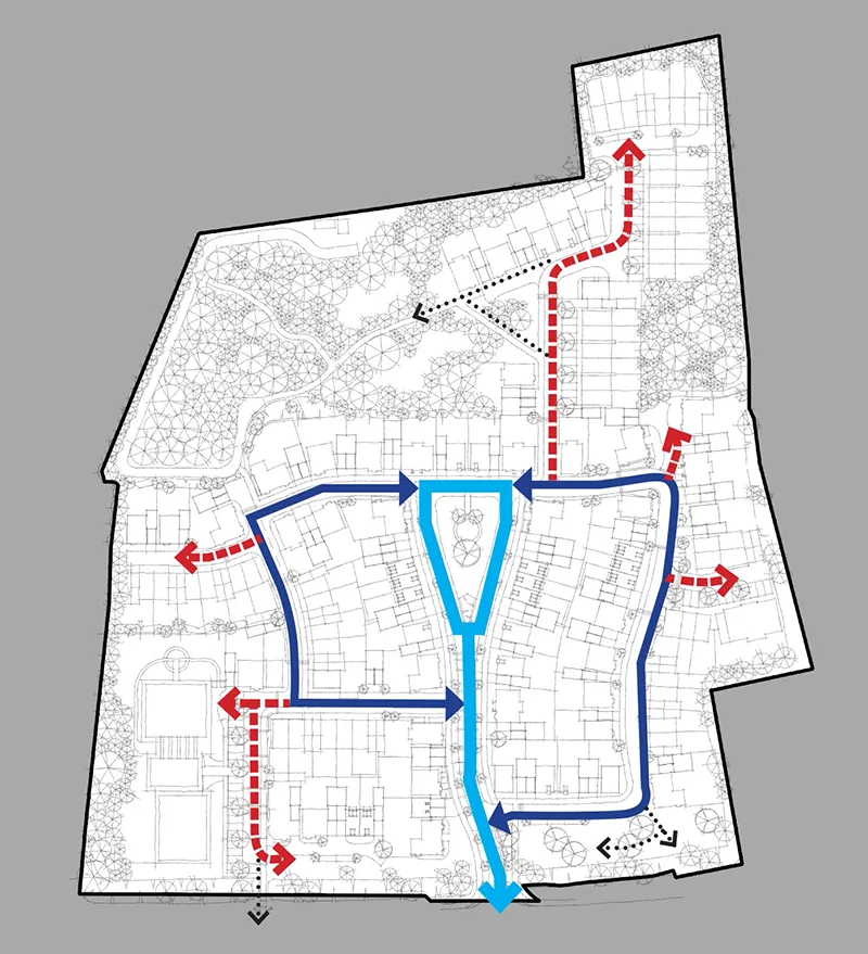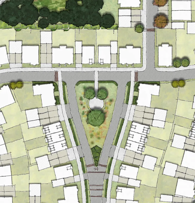 A simple perimeter block structure and clear street hierarchy combine to create a central village green and connect with the existing woodland