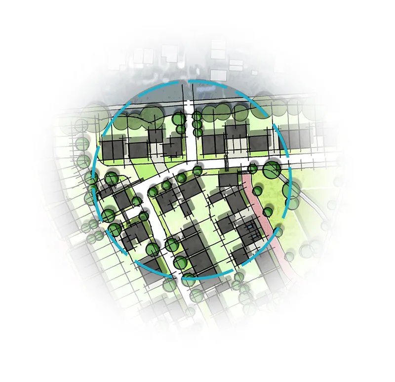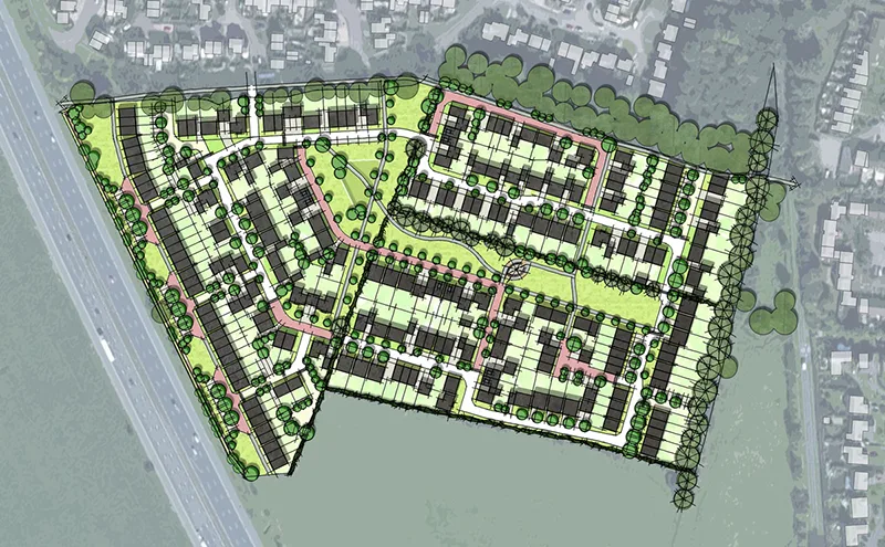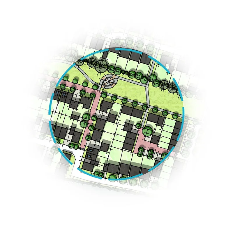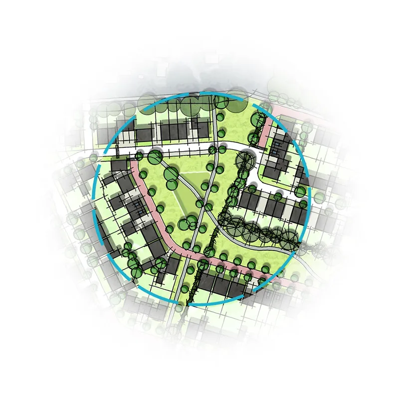 The main driven behind this feasibility project was the retention of landscape features both on the periphery of the site as well as those features within the site. In order to ensure the longevity of the existing landscape elements a large linear public open space is proposed centrally through the scheme. This central green ‘lung’ enables the existing landscape elements to become integral features within the proposed residential environment giving the scheme an enhanced sense of instant maturity.